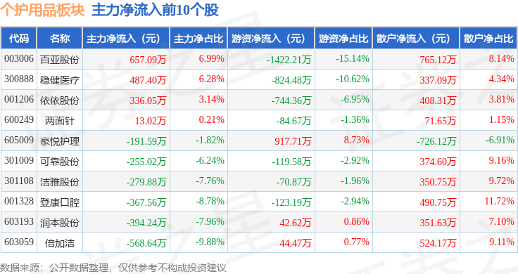 从资金流向上来看,当日个护用品板块主力资金净流出2417.78万元,游资资金净流出367.24万元,散户资金净流入2785.03万元。个护用品板块个股资金流向见下表: