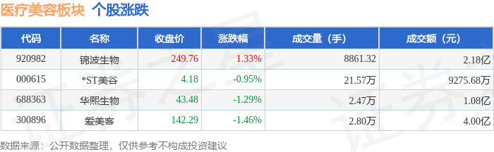 证券之星消息,12月23日医疗美容板块较上一交易日下跌1.37%,爱美客领跌。当日上证指数报收于3919.98,上涨0.07%。深证成指报收于13368.99,上涨0.27%。医疗美容板块个股涨跌见下表: