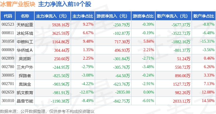 从资金流向上来看,当日冰雪产业板块主力资金净流出10.32亿元,游资资金净流入1.12亿元,散户资金净流入9.2亿元。冰雪产业板块个股资金流向见下表: