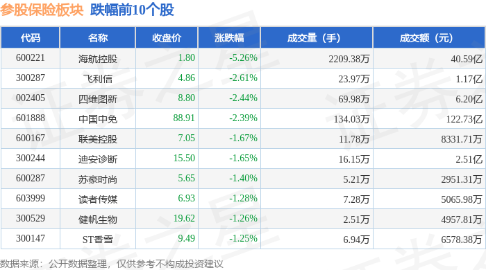 证券之星消息,12月23日参股保险板块较上一交易日下跌1.62%,海航控股领跌。当日上证指数报收于3919.98,上涨0.07%。深证成指报收于13368.99,上涨0.27%。参股保险板块个股涨跌见下表: