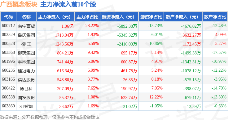 从资金流向上来看,当日广西概念板块主力资金净流出1.61亿元,游资资金净流出9978.97万元,散户资金净流入2.61亿元。广西概念板块个股资金流向见下表: