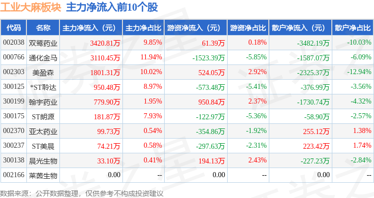 从资金流向上来看,当日工业大麻板块主力资金净流出6.79亿元,游资资金净流入1.37亿元,散户资金净流入5.42亿元。工业大麻板块个股资金流向见下表: