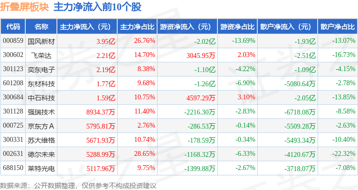 从资金流向上来看,当日折叠屏板块主力资金净流出20.15亿元,游资资金净流入4.02亿元,散户资金净流入16.12亿元。折叠屏板块个股资金流向见下表: