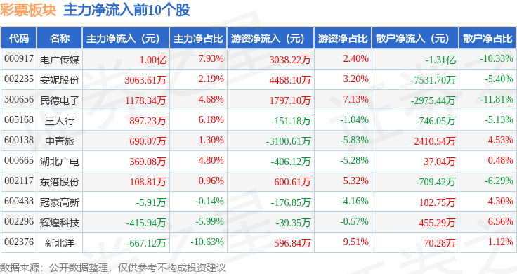 从资金流向上来看,当日彩票板块主力资金净流出6521.48万元,游资资金净流入8087.24万元,散户资金净流出1565.75万元。彩票板块个股资金流向见下表: