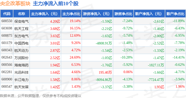 从资金流向上来看,当日央企改革板块主力资金净流出118.12亿元,游资资金净流入1.37亿元,散户资金净流入116.75亿元。央企改革板块个股资金流向见下表: