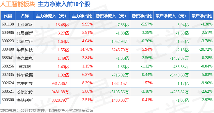 从资金流向上来看,当日人工智能板块主力资金净流出101.65亿元,游资资金净流入5.67亿元,散户资金净流入95.98亿元。人工智能板块个股资金流向见下表: