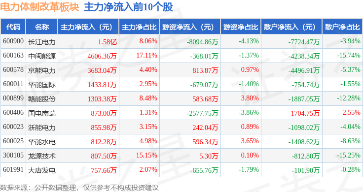 从资金流向上来看,当日电力体制改革板块主力资金净流出1.55亿元,游资资金净流入6265.99万元,散户资金净流入9239.44万元。电力体制改革板块个股资金流向见下表: