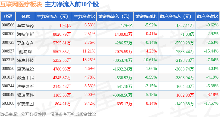 从资金流向上来看,当日互联网医疗板块主力资金净流出11.87亿元,游资资金净流入1.99亿元,散户资金净流入9.88亿元。互联网医疗板块个股资金流向见下表: