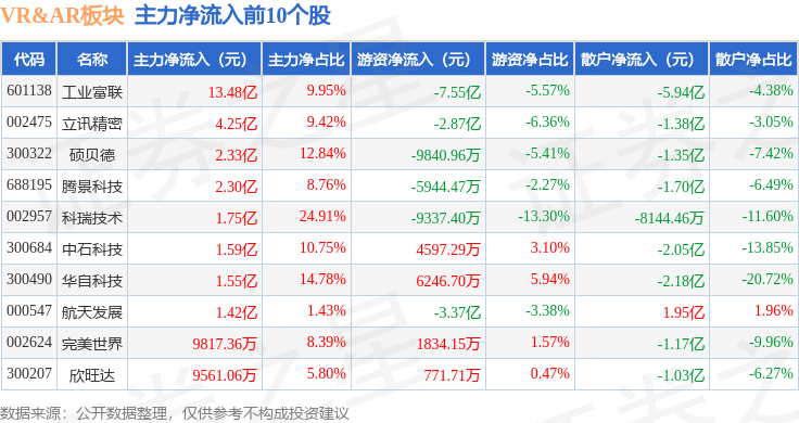 从资金流向上来看,当日VR&AR板块主力资金净流出25.03亿元,游资资金净流出8.46亿元,散户资金净流入33.49亿元。VR&AR板块个股资金流向见下表: