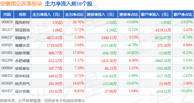 从资金流向上来看,当日安徽国企改革板块主力资金净流出8145.89万元,游资资金净流出9311.54万元,散户资金净流入1.75亿元。安徽国企改革板块个股资金流向见下表: