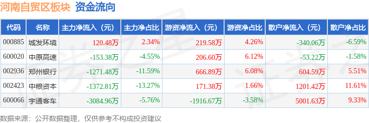 从资金流向上来看,当日河南自贸区板块主力资金净流出5762.14万元,游资资金净流出652.21万元,散户资金净流入6414.36万元。河南自贸区板块个股资金流向见下表: