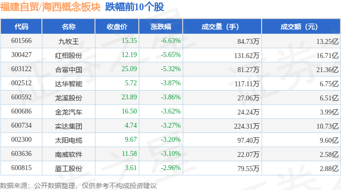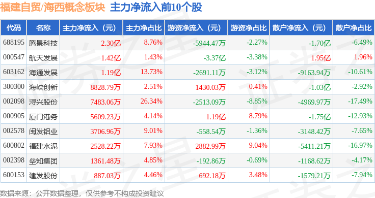 从资金流向上来看,当日福建自贸/海西概念板块主力资金净流出13.12亿元,游资资金净流出3.5亿元,散户资金净流入16.62亿元。福建自贸/海西概念板块个股资金流向见下表: