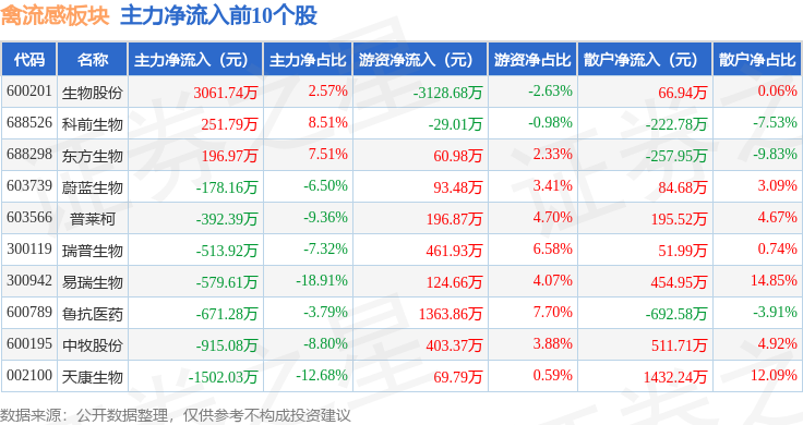 从资金流向上来看,当日禽流感板块主力资金净流出9929.4万元,游资资金净流入4836.3万元,散户资金净流入5093.11万元。禽流感板块个股资金流向见下表: