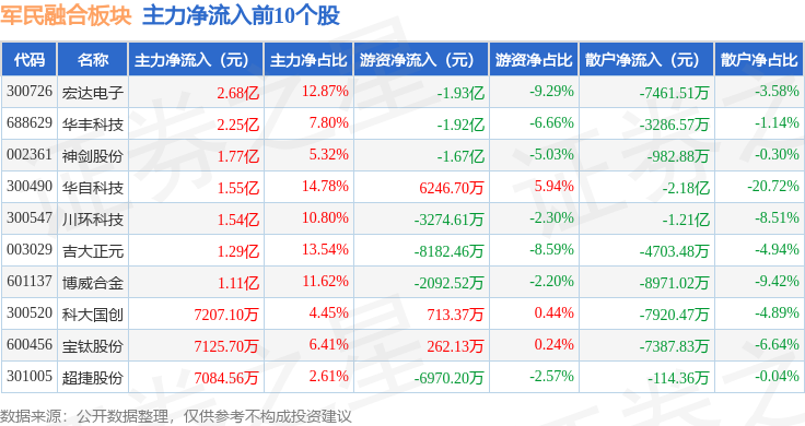 从资金流向上来看,当日军民融合板块主力资金净流出76.45亿元,游资资金净流入4.56亿元,散户资金净流入71.89亿元。军民融合板块个股资金流向见下表: