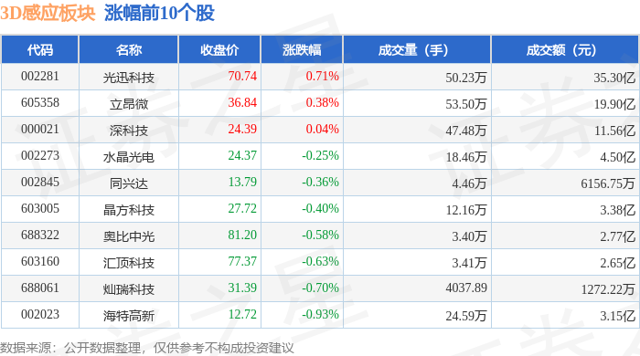 证券之星消息,12月23日3D感应板块较上一交易日下跌0.91%,乾照光电领跌。当日上证指数报收于3919.98,上涨0.07%。深证成指报收于13368.99,上涨0.27%。3D感应板块个股涨跌见下表: