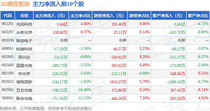 从资金流向上来看,当日3D感应板块主力资金净流出11.0亿元,游资资金净流出363.26万元,散户资金净流入11.03亿元。3D感应板块个股资金流向见下表: