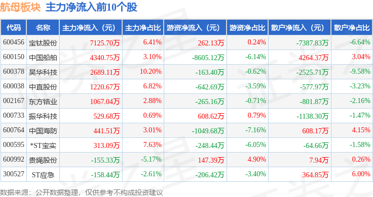 从资金流向上来看,当日航母板块主力资金净流出8.91亿元,游资资金净流出1763.27万元,散户资金净流入9.08亿元。航母板块个股资金流向见下表: