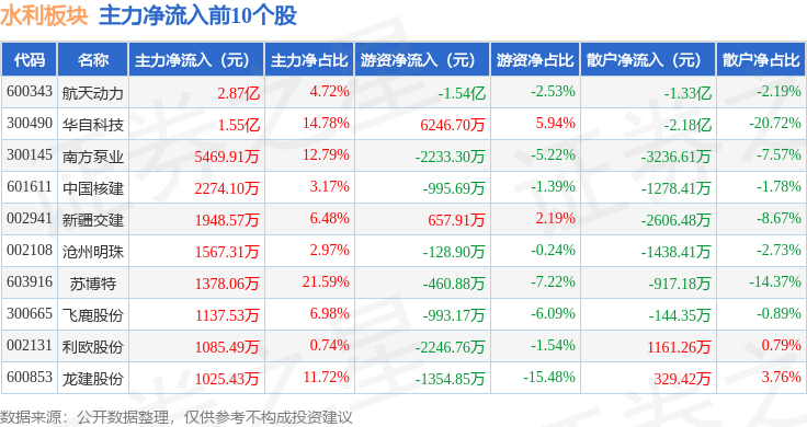 从资金流向上来看,当日水利板块主力资金净流入1.42亿元,游资资金净流出8995.04万元,散户资金净流出5188.01万元。水利板块个股资金流向见下表: