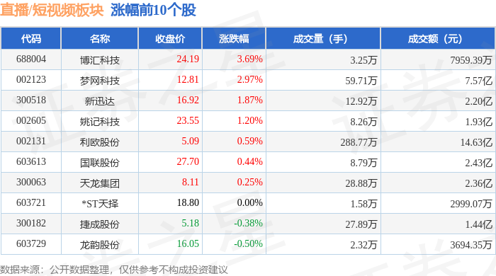 证券之星消息,12月23日直播/短视频板块较上一交易日下跌0.96%,佳创视讯领跌。当日上证指数报收于3919.98,上涨0.07%。深证成指报收于13368.99,上涨0.27%。直播/短视频板块个股涨跌见下表: