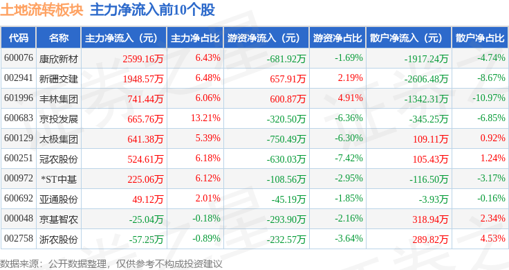 从资金流向上来看,当日土地流转板块主力资金净流出8.38亿元,游资资金净流入2.29亿元,散户资金净流入6.09亿元。土地流转板块个股资金流向见下表: