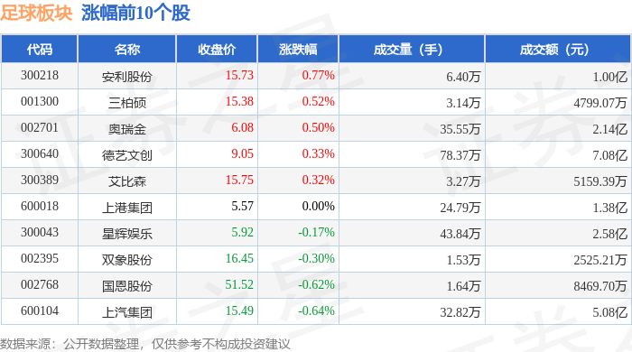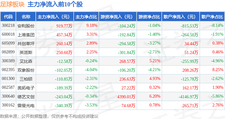 从资金流向上来看,当日足球板块主力资金净流出3.66亿元,游资资金净流入7068.64万元,散户资金净流入2.96亿元。足球板块个股资金流向见下表: