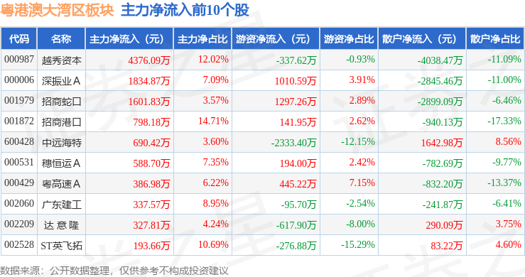从资金流向上来看,当日粤港澳大湾区板块主力资金净流出7.76亿元,游资资金净流入2.46亿元,散户资金净流入5.3亿元。粤港澳大湾区板块个股资金流向见下表: