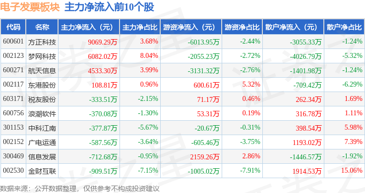 从资金流向上来看,当日电子发票板块主力资金净流出7090.42万元,游资资金净流出4650.99万元,散户资金净流入1.17亿元。电子发票板块个股资金流向见下表: