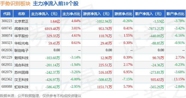 从资金流向上来看,当日手势识别板块主力资金净流出4.47亿元,游资资金净流出8278.66万元,散户资金净流入5.3亿元。手势识别板块个股资金流向见下表:
