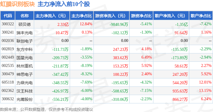 从资金流向上来看,当日虹膜识别板块主力资金净流出2.91亿元,游资资金净流出6657.08万元,散户资金净流入3.58亿元。虹膜识别板块个股资金流向见下表: