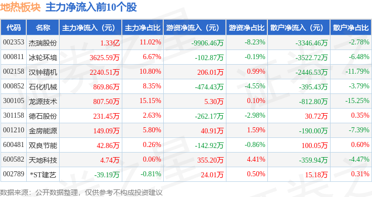 从资金流向上来看,当日地热板块主力资金净流出4.31亿元,游资资金净流出2091.97万元,散户资金净流入4.51亿元。地热板块个股资金流向见下表: