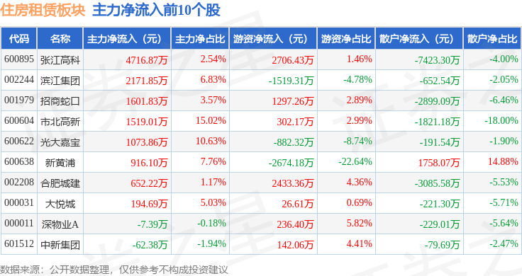 从资金流向上来看,当日住房租赁板块主力资金净流出4.27亿元,游资资金净流入1.58亿元,散户资金净流入2.69亿元。住房租赁板块个股资金流向见下表:
