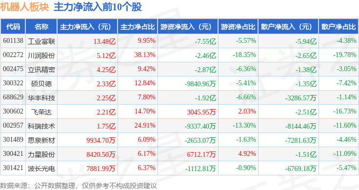 从资金流向上来看,当日机器人板块主力资金净流出83.88亿元,游资资金净流入3.91亿元,散户资金净流入79.97亿元。机器人板块个股资金流向见下表: