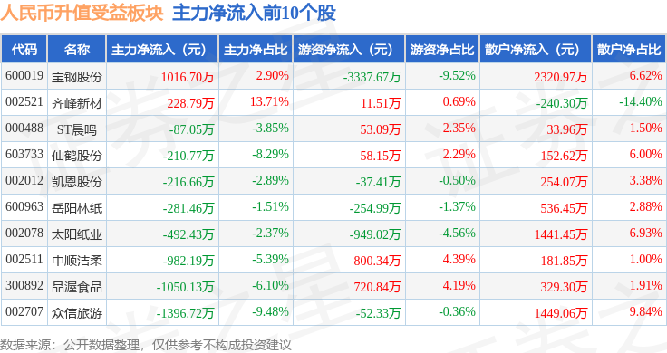 从资金流向上来看,当日人民币升值受益板块主力资金净流出20.53亿元,游资资金净流入6.09亿元,散户资金净流入14.44亿元。人民币升值受益板块个股资金流向见下表: