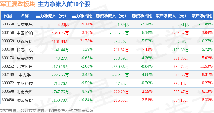 从资金流向上来看,当日军工混改板块主力资金净流出1044.66万元,游资资金净流出2.18亿元,散户资金净流入2.28亿元。军工混改板块个股资金流向见下表: