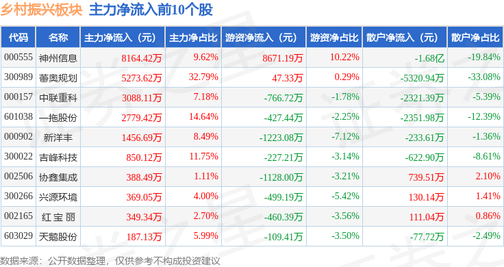 从资金流向上来看,当日乡村振兴板块主力资金净流出3.59亿元,游资资金净流入1.49亿元,散户资金净流入2.1亿元。乡村振兴板块个股资金流向见下表: