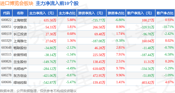 从资金流向上来看,当日进口博览会板块主力资金净流出9687.75万元,游资资金净流入3692.12万元,散户资金净流入5995.63万元。进口博览会板块个股资金流向见下表: