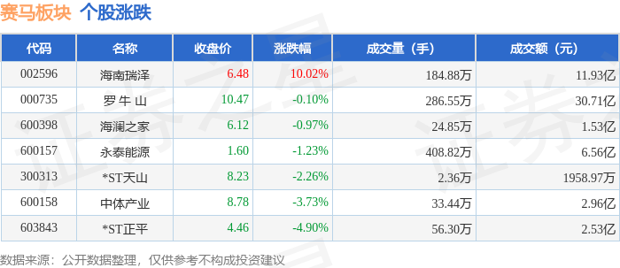 证券之星消息,12月23日赛马板块较上一交易日下跌0.6%,*ST正平领跌。当日上证指数报收于3919.98,上涨0.07%。深证成指报收于13368.99,上涨0.27%。赛马板块个股涨跌见下表:
