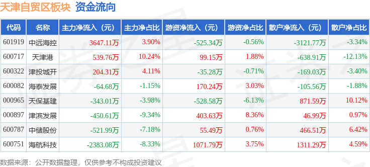 从资金流向上来看,当日天津自贸区板块主力资金净流入627.8万元,游资资金净流入711.11万元,散户资金净流出1338.91万元。天津自贸区板块个股资金流向见下表: