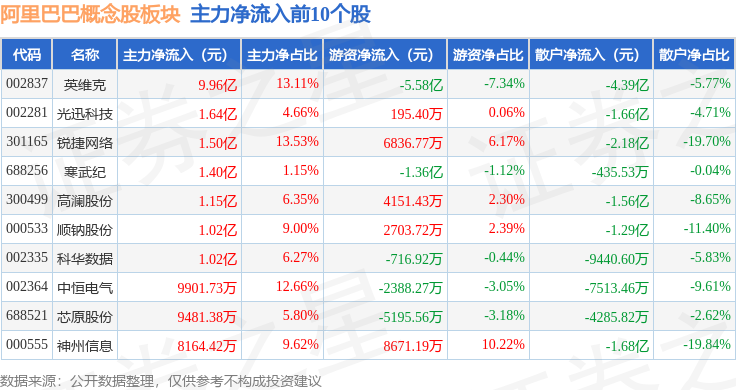 从资金流向上来看,当日阿里巴巴概念股板块主力资金净流出20.91亿元,游资资金净流入5.29亿元,散户资金净流入15.61亿元。阿里巴巴概念股板块个股资金流向见下表: