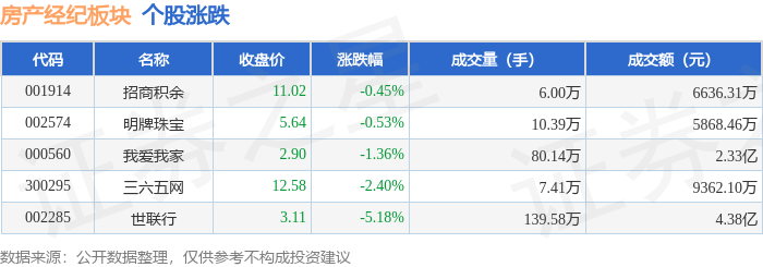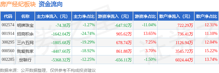 从资金流向上来看,当日房产经纪板块主力资金净流出1.33亿元,游资资金净流入1142.21万元,散户资金净流入1.22亿元。房产经纪板块个股资金流向见下表: