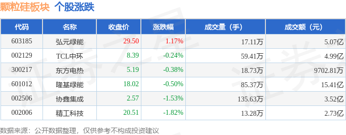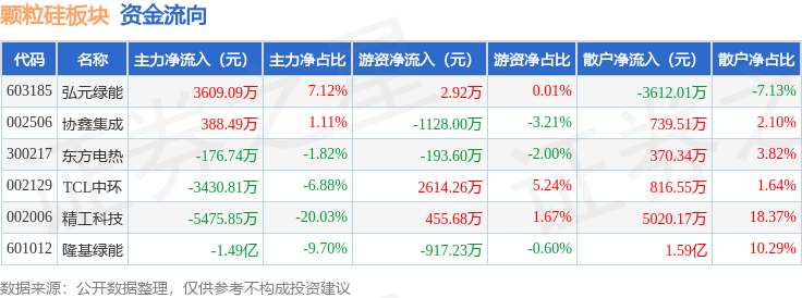从资金流向上来看,当日颗粒硅板块主力资金净流出2.0亿元,游资资金净流入834.05万元,散户资金净流入1.92亿元。颗粒硅板块个股资金流向见下表: