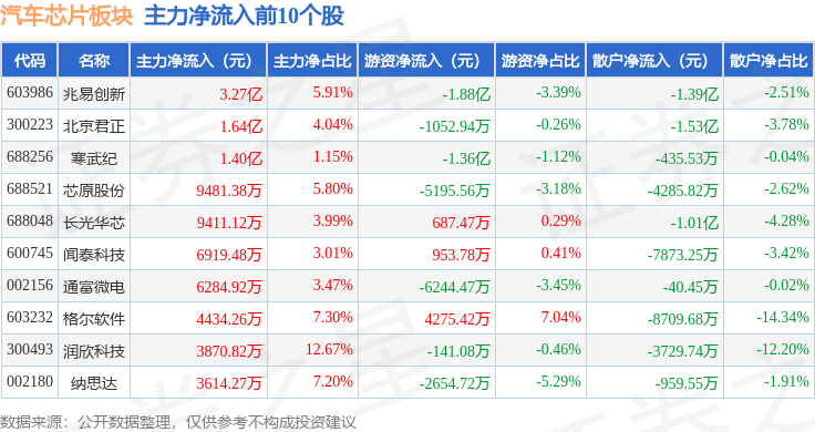 从资金流向上来看,当日汽车芯片板块主力资金净流出17.23亿元,游资资金净流入1.71亿元,散户资金净流入15.52亿元。汽车芯片板块个股资金流向见下表: