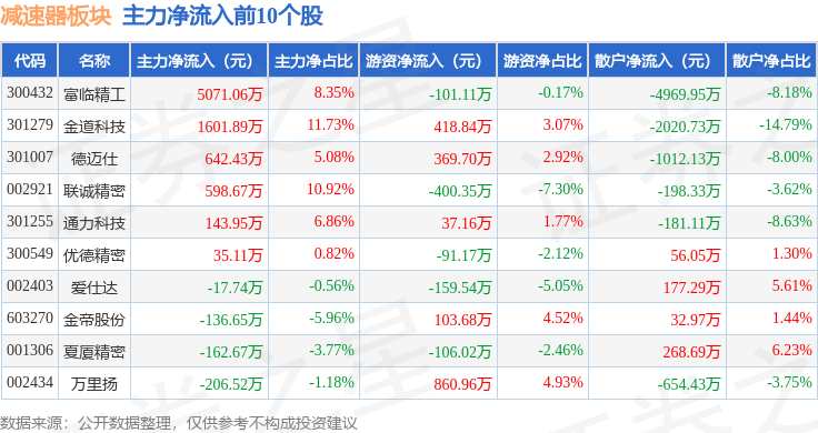 从资金流向上来看,当日减速器板块主力资金净流出9.32亿元,游资资金净流出2700.45万元,散户资金净流入9.59亿元。减速器板块个股资金流向见下表: