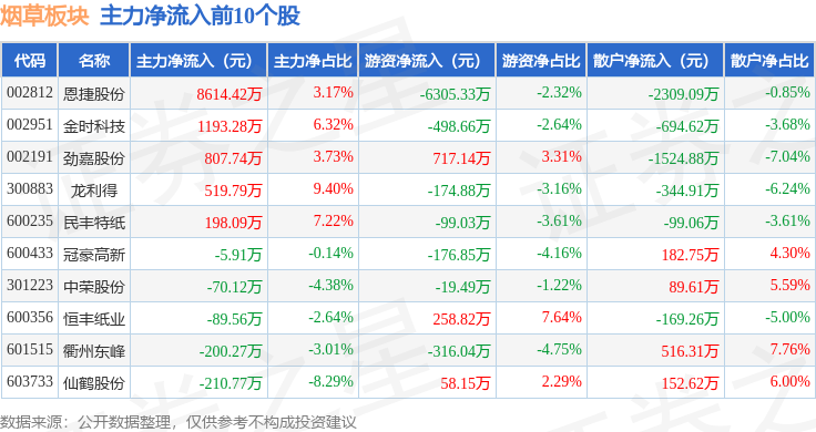 从资金流向上来看,当日烟草板块主力资金净流出9.06亿元,游资资金净流入1.99亿元,散户资金净流入7.07亿元。烟草板块个股资金流向见下表: