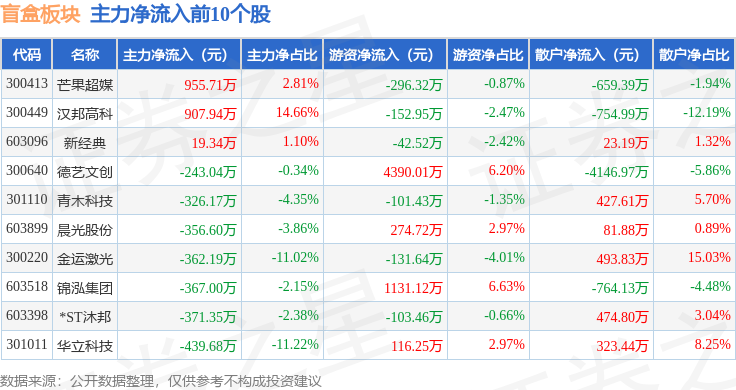 从资金流向上来看,当日盲盒板块主力资金净流出2.84亿元,游资资金净流入1.14亿元,散户资金净流入1.71亿元。盲盒板块个股资金流向见下表: