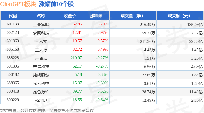 证券之星消息,12月23日ChatGPT板块较上一交易日上涨2.21%,工业富联领涨。当日上证指数报收于3919.98,上涨0.07%。深证成指报收于13368.99,上涨0.27%。ChatGPT板块个股涨跌见下表: