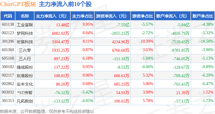 从资金流向上来看,当日ChatGPT板块主力资金净流入3.5亿元,游资资金净流出4.5亿元,散户资金净流入9932.14万元。ChatGPT板块个股资金流向见下表: