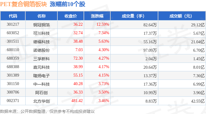 证券之星消息,12月23日PET复合铜箔板块较上一交易日上涨2.31%,铜冠铜箔领涨。当日上证指数报收于3919.98,上涨0.07%。深证成指报收于13368.99,上涨0.27%。PET复合铜箔板块个股涨跌见下表: