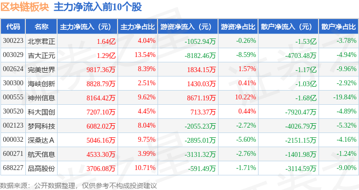从资金流向上来看,当日区块链板块主力资金净流出35.89亿元,游资资金净流入8.77亿元,散户资金净流入27.12亿元。区块链板块个股资金流向见下表: