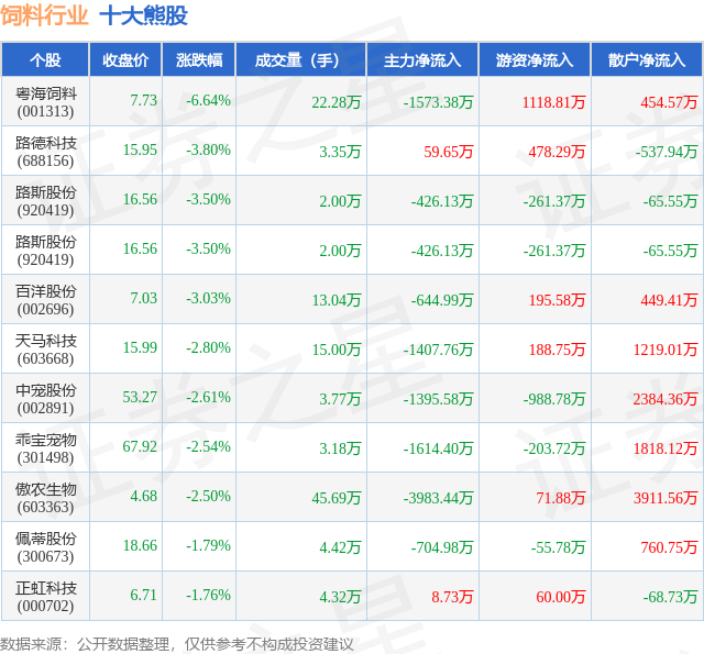 个股表现方面,饲料行业当日领跌股为粤海饲料(001313),该股当日报收7.73,下跌6.64%,成交量22.28万,主力资金净流出1573.38万元。路德科技(688156)以下跌3.8%紧随其后,该股当日成交量3.35万,主力资金净流入59.65万元。除此之外,路斯股份(920419)、路斯股份(920419)、百洋股份(002696)均进入当日熊股之列。具体个股列表见下表: